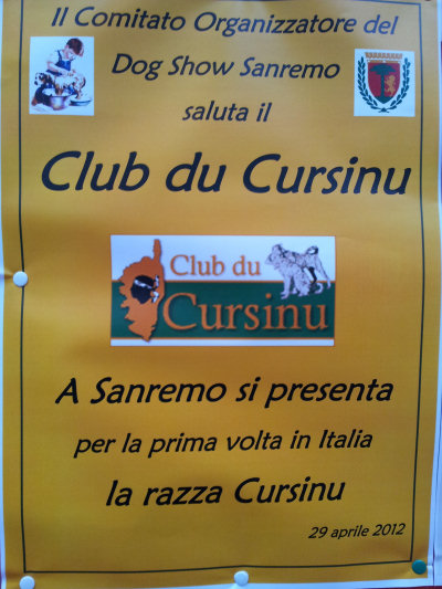 Pour la première fois le cursinu a pu se présenter à une exposition internationale hors de France. Cela grâce à l'initiative et l'opiniâtreté d'Isa Foata, de Jean Pierre Morelli et Gilles Cano. Ils ont su mobiliser les responsables de l'exposition de San Remo et avec l'action du Président du comité d'organisation Pietro Paolo Condo auprès de l'ENCI et de la SCC, le cursinu a fait son entrée sur la scène internationale avec un trophée spécialement mis en jeu pour lui. Une action et un honneur appréciés par les responsables du Club. JD ROSSI Exposition canine - SAN REMO - 29 AVRIL 2012 - juge : Monsieur JEAN PAUL KERIHUEL