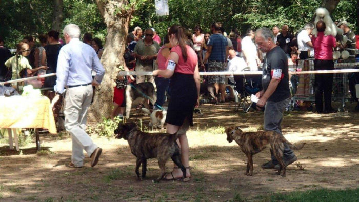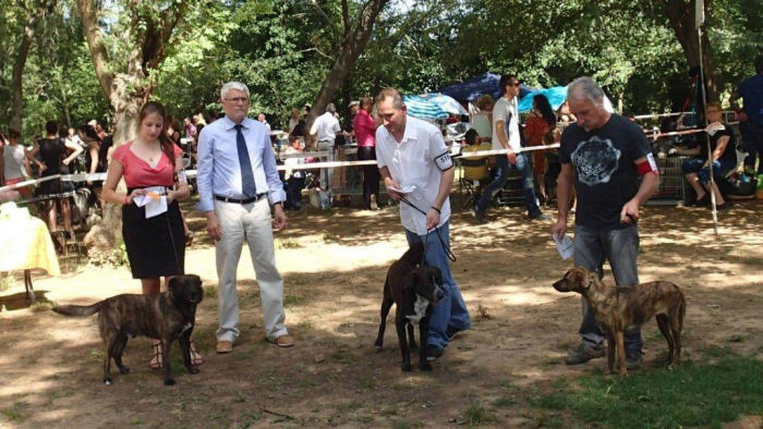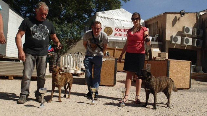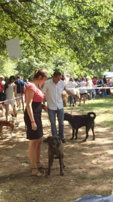 Prop: Mme PISI - Prod: M. BIKODOROFF L'exposition de Trets se déroulait, pour la troisième année, dans un joli parc ombragé. Le club du cursinu était représenté collégialement par les propriétaires présents et leurs accompagnateurs .Cette petite délégation a, dans une grande convivialité, présenté la race corse et donné des renseignements et des flyers aux quelques visiteurs intéressés. Les Cursini n'étaient que trois, cette année : 1 femelle en classe jeune et 2 mâles en classe ouverte (rappel : ils étaient 4 en 2013 et 5 en 2012). C'est à monsieur Jean-Paul Kérihuel, juge de la Société Centrale Canine, que revenait l'honneur d'examiner les trois sujets. Il a reconnu que les chiens étaient bien représentatifs puisqu'il leur a accordé à tous le qualificatif d'excellent La présence d'Erdu, " l'ancien ", a permis à monsieur Kérihuel (juge très sensibilisé aux particularités de cette race) d'indiquer aux " petits nouveaux ", lors de son débriefing ,les infimes détails qu'ils pourraient encore améliorer pour progresser. Il est bien naturel que si le futur classement H'Oro nécessitait le CACS de cette exposition, Erdu le lui cèderait avec grand honneur. A l'issue de cette première sélection, propriétaires et accompagnateurs ont partagé quelques spécialités charcutières venues de l'île. Nicole et Stéphane, les propriétaires de H'Oro, ont eu la délicatesse de revenir dans l'après midi (avec quelques présents) pour encourager Indipendenza et Erdu sélectionnés pour le ring d'honneur. A l'issue de cette journée, les trois chiens ont reçu une coupe récompensant leurs qualités. Tous les amateurs du cursinu présents m'ont autorisé à préciser que notre journée s'est clôturée dans une ambiance amicale et désintéressée. Suite à l'exceptionnelle absence de la déléguée Provence Cote d'Azur, Mme Anne-Marie Brossard (que je salue et espère revoir bientôt), j'ai rédigé ce petit compte rendu de l'exposition. Jean-Pierre Morelli, correspondant ponctuel du club du cursinu.